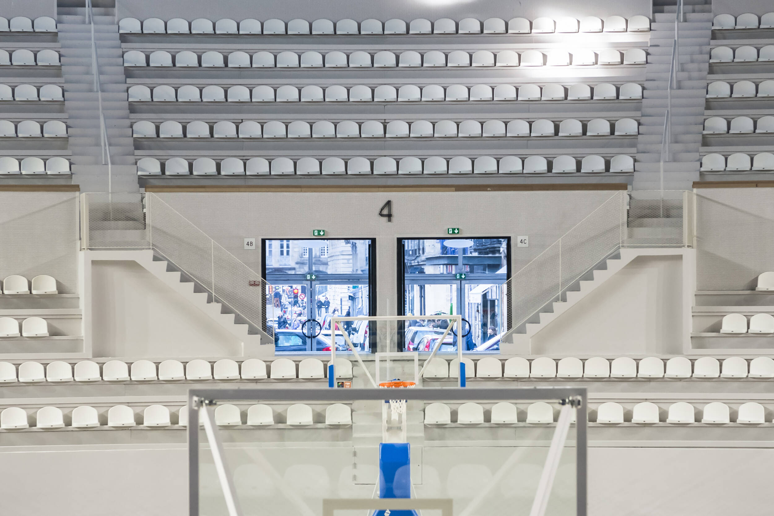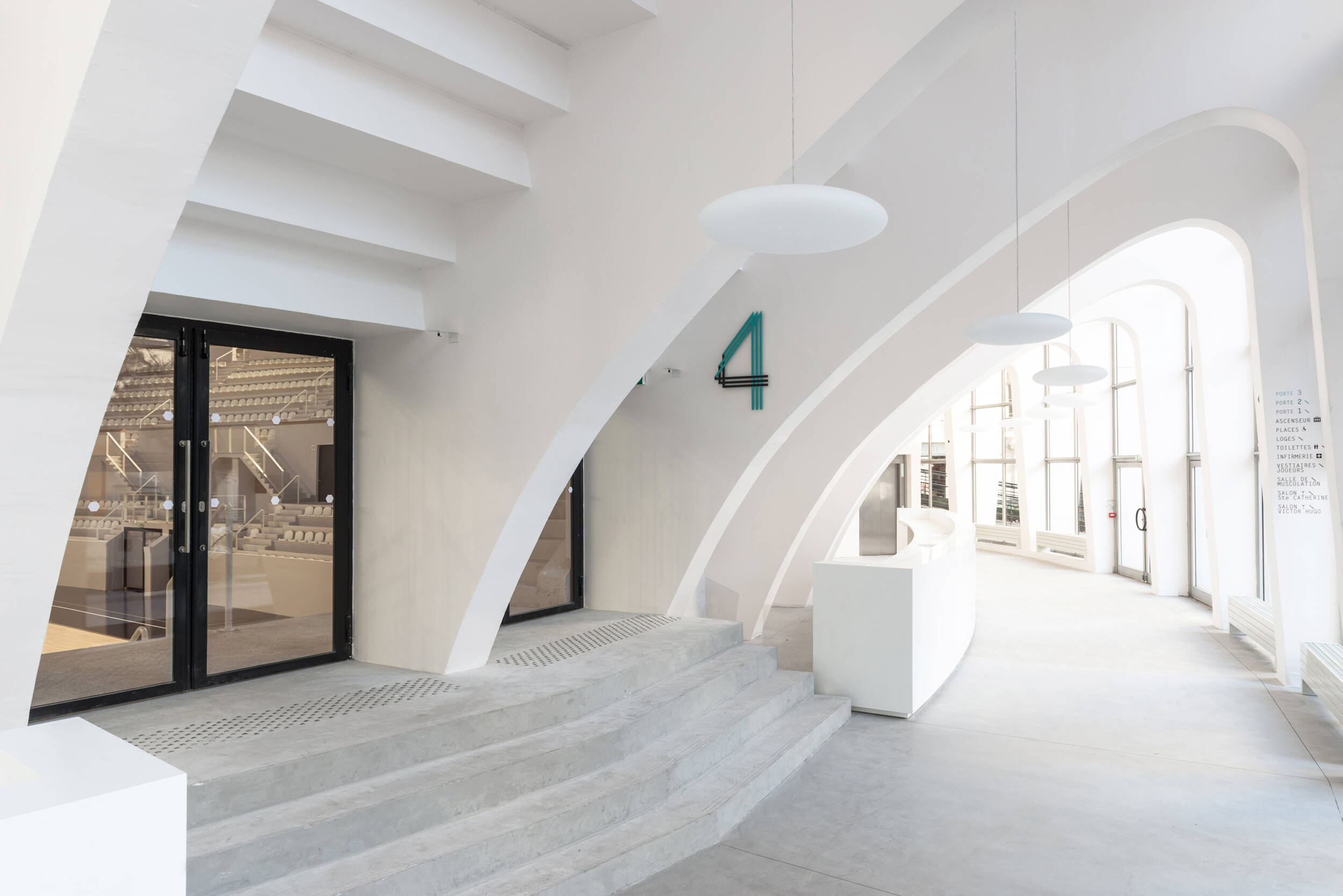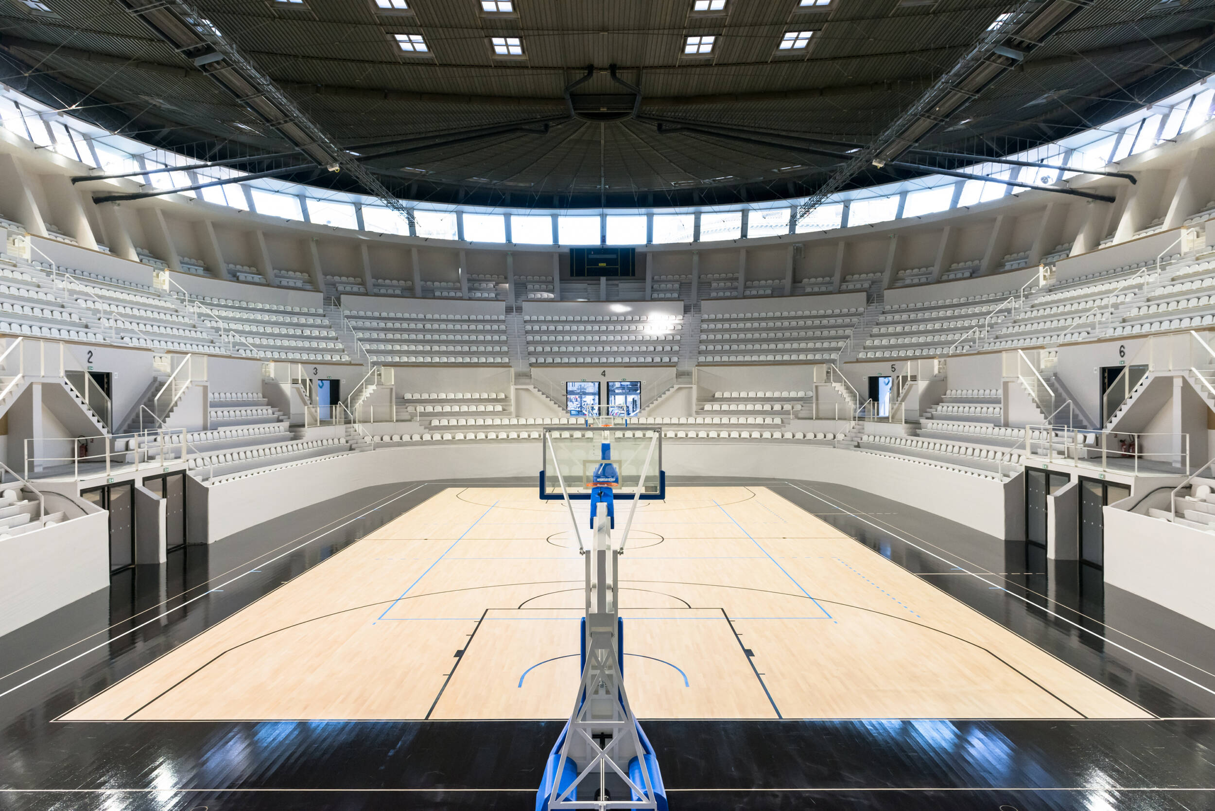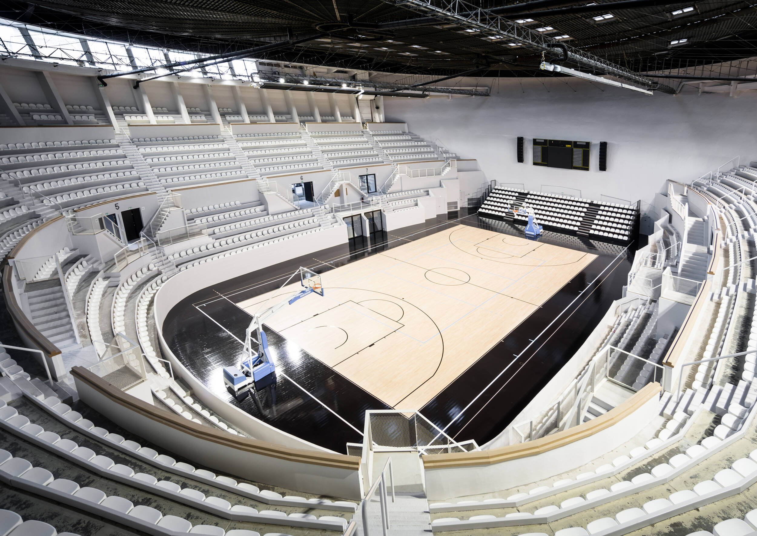 Confort visuel : Éclairage naturel privilégié, coordination optimale entre éclairage naturel et artificiel. Rétablissement et création d’ouvertures pour obtenir une lumière naturelle de 300 lux minimum assurant la pratique sportive journalière (pour le public scolaire) sans lumière artificielle. Restauration des puits de lumière, anneau de lumière naturelle en haut des gradins grâce à la suppression de panneaux de béton. Afin d’amener la lumière vers tous les espaces annexes, la coursive est conçue sur deux niveaux : haute au niveau de la place de la Ferme de Richemont, de plain-pied sur le parvis. Suppression des planchers latéraux pour éclairer naturellement les espaces de réception. Amélioration de la courbe de visibilité pour les spectateurs.