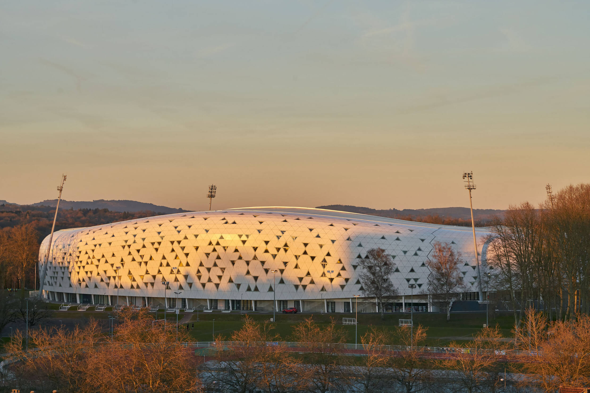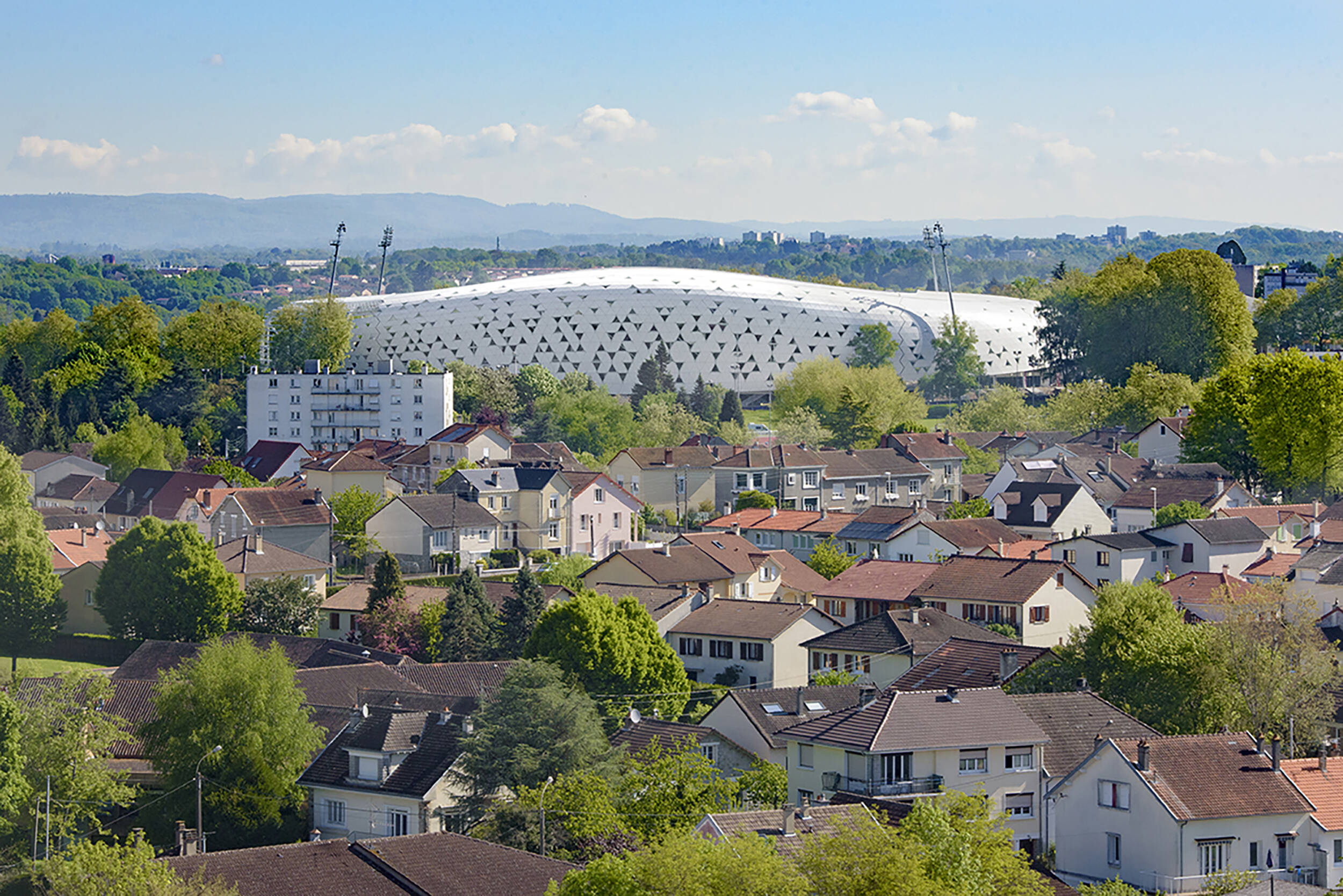 Respect des alignements d’arbres qui ceinturent le stade actuel par adéquation des « courbes » de l’enveloppe du nouveau stade à celles formées par les plantations.