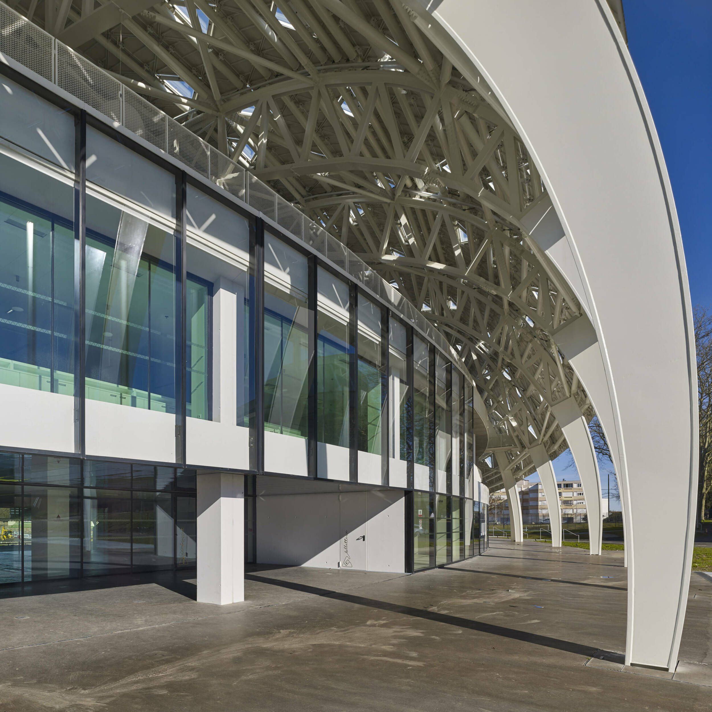 Positionnement du contrôle d’accès en pied de façade avec intégration d’un restaurant traversant enter parvis et arène.