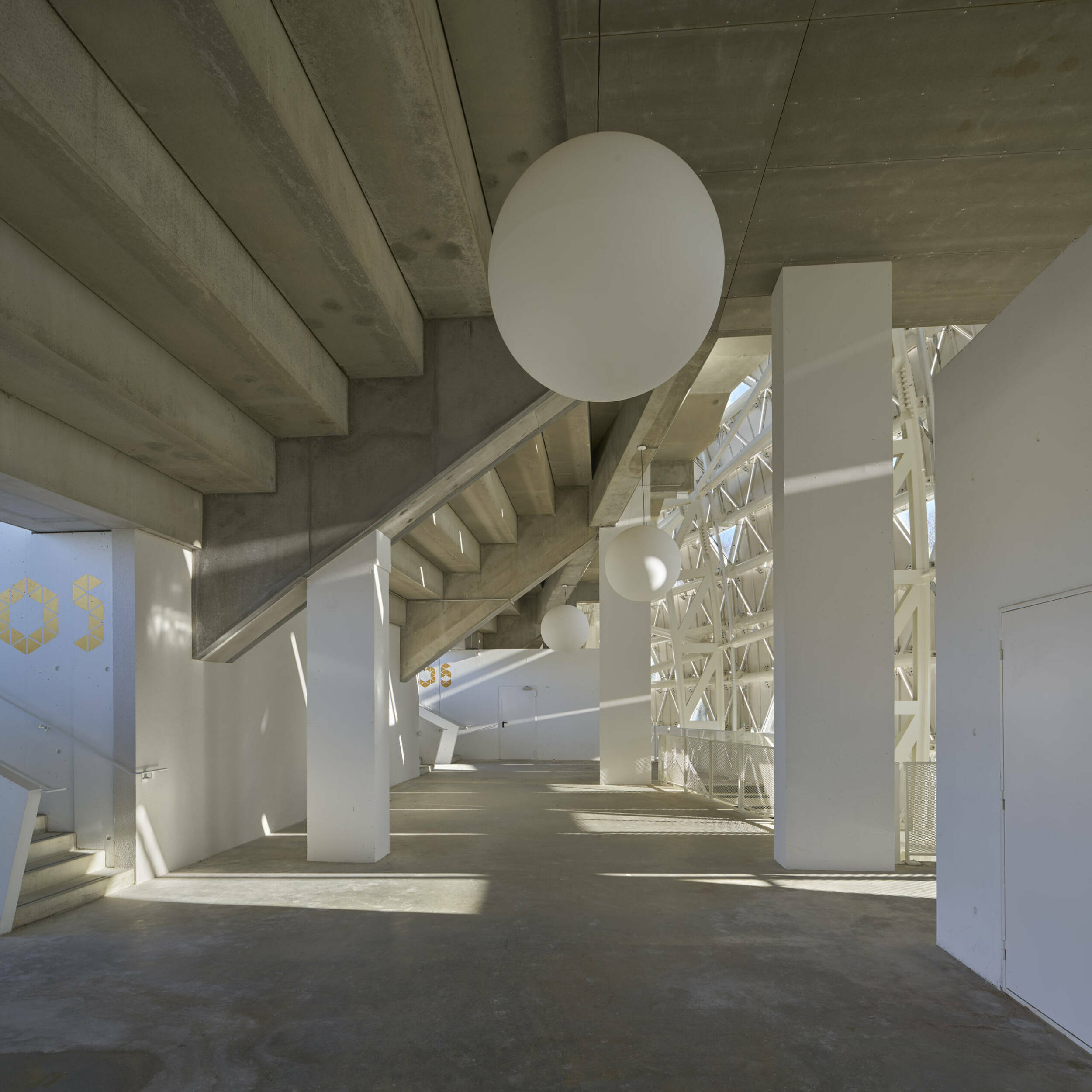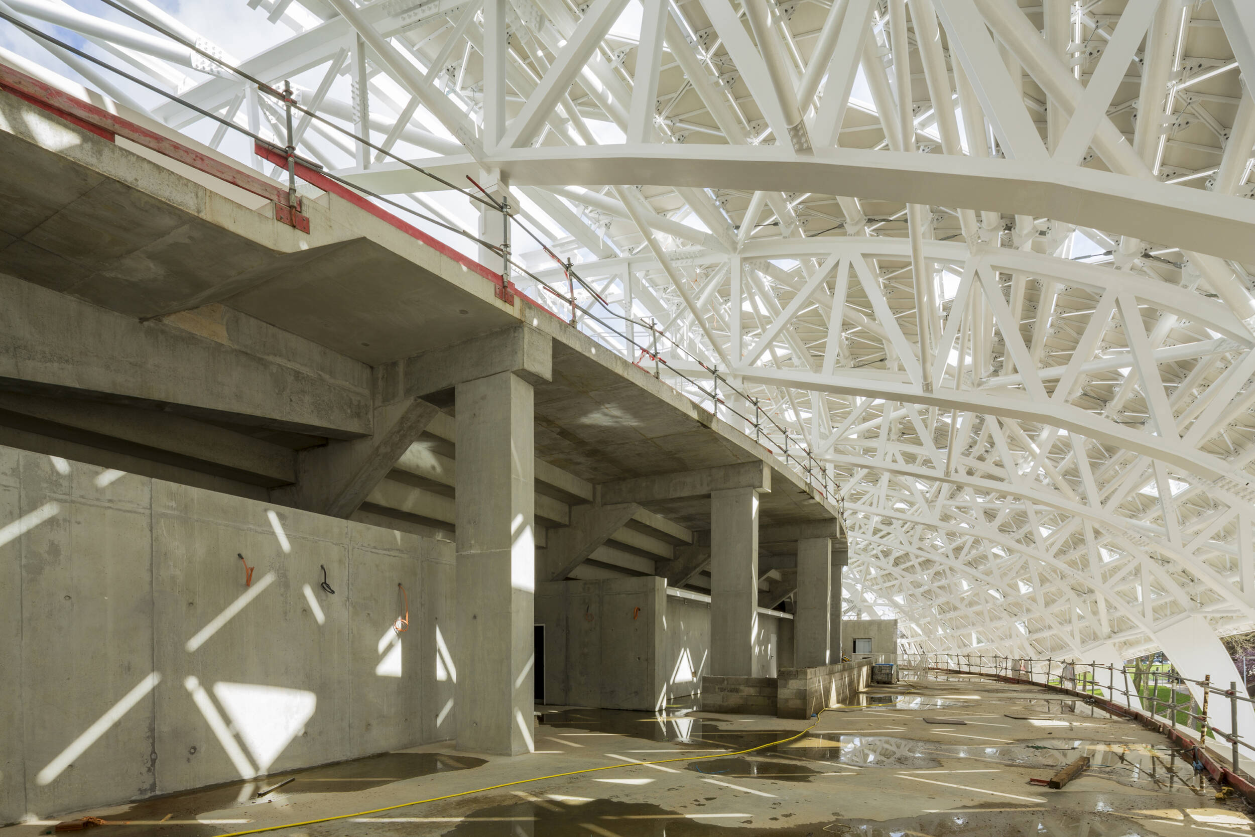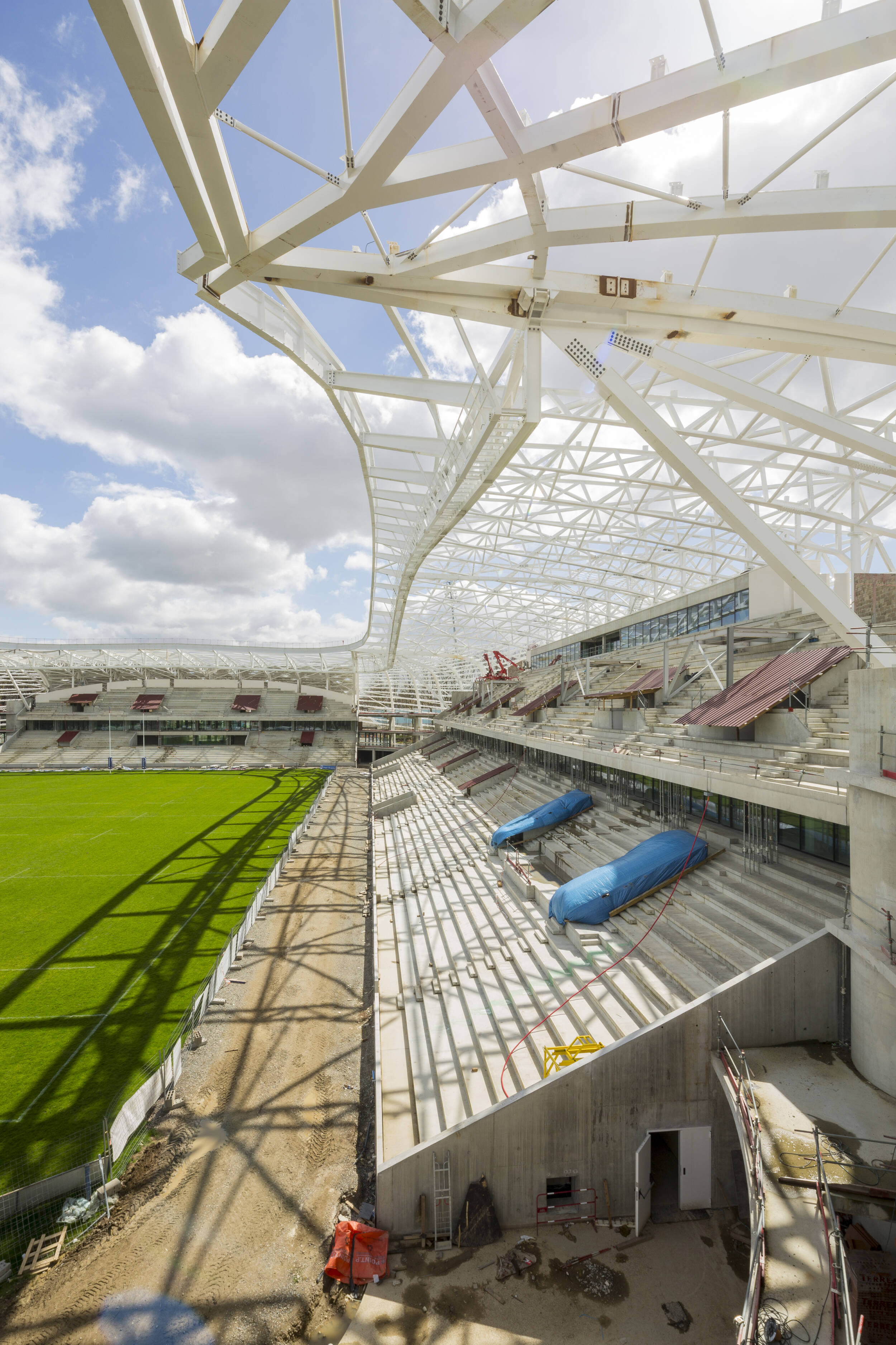 PHASE 1 : 9700 places : Démolition / Reconstruction des tribunes Ouest et Sud comprenant en tribune Ouest la zone sportives, et officielle, la zone médias et la tribune de presse, la tribune VIP et ses loges et salons attenant, et en tribune Sud, la zone business seat et son grand salon, une zone grand public, et le restaurant.