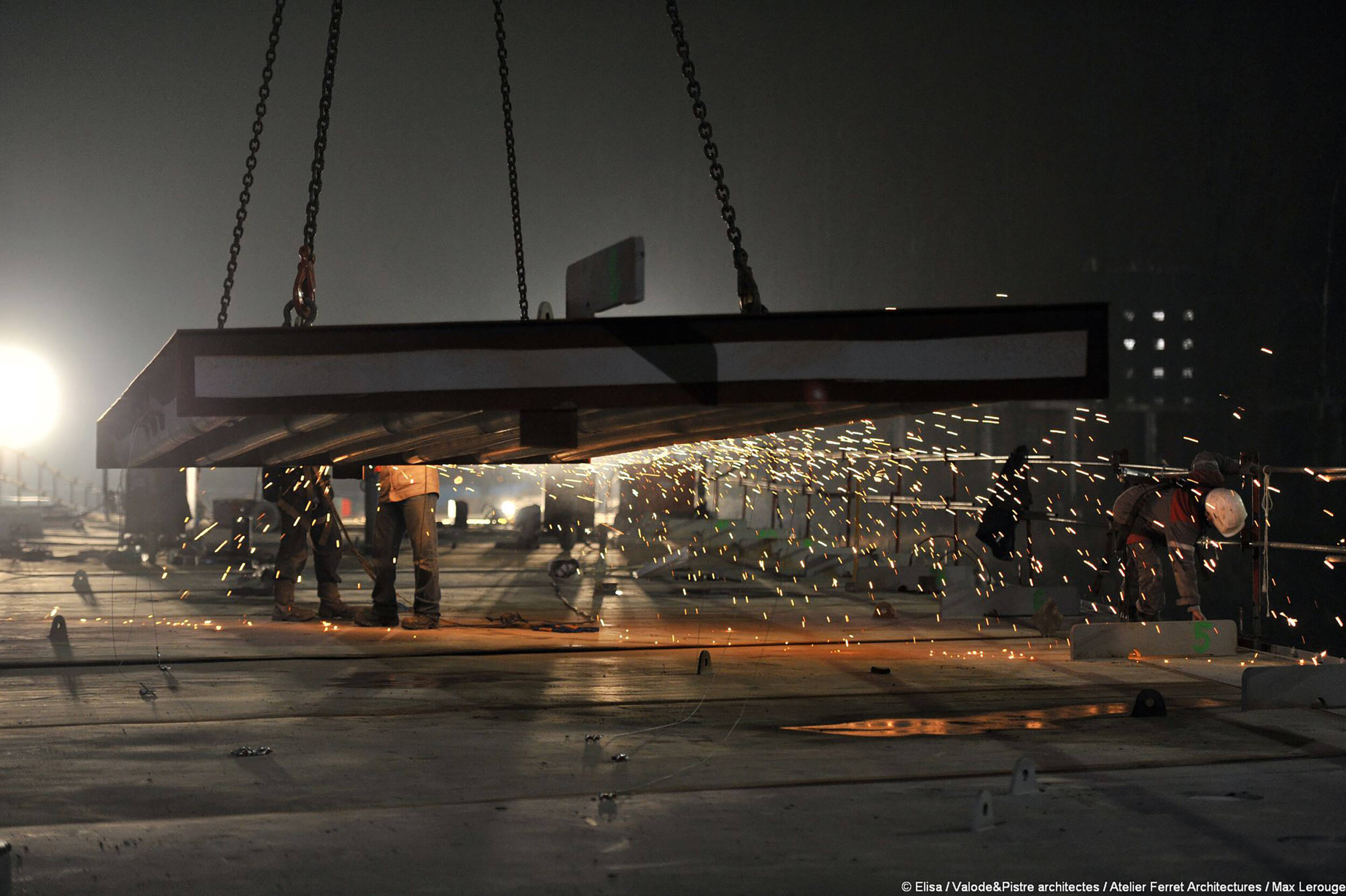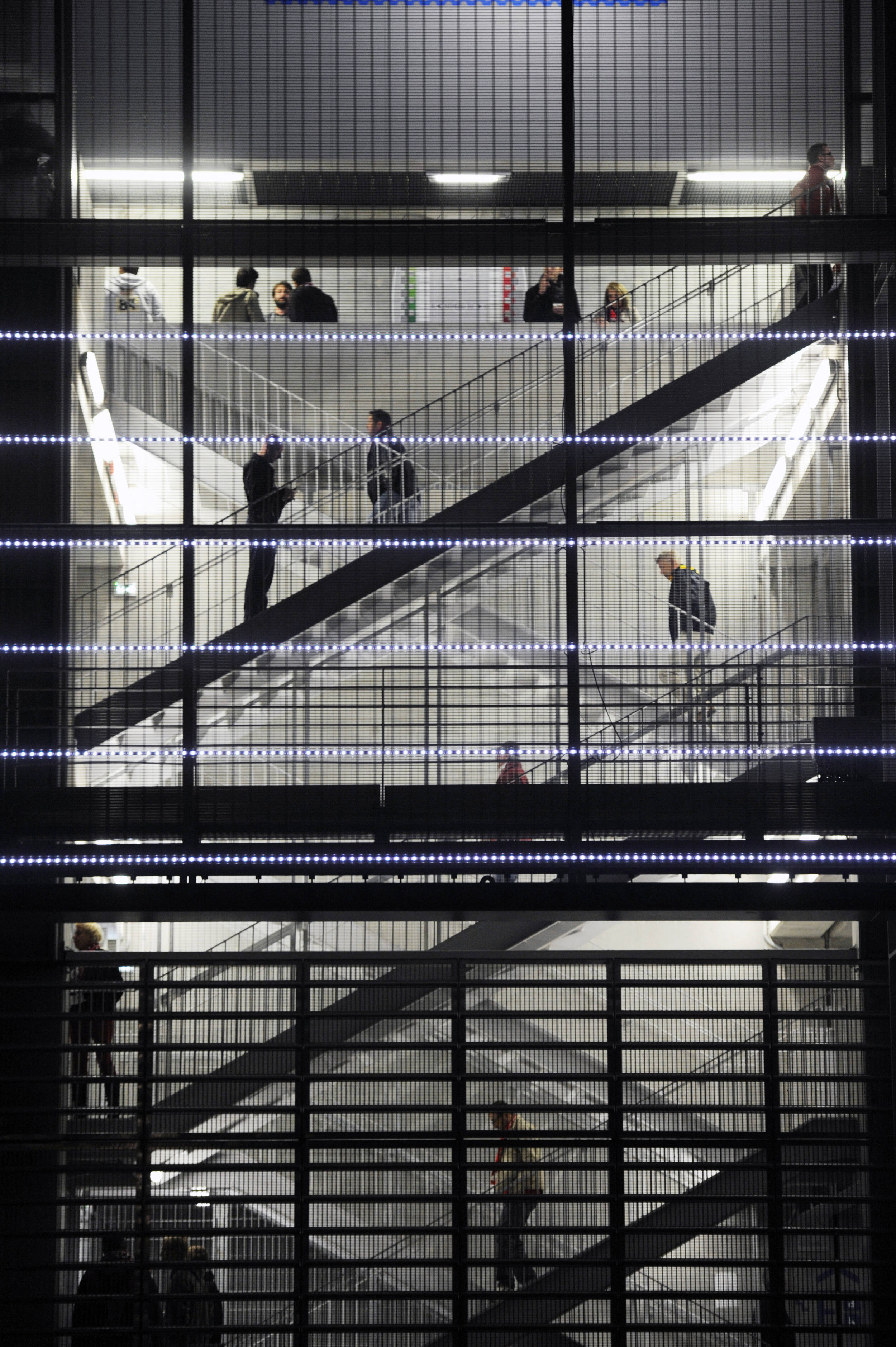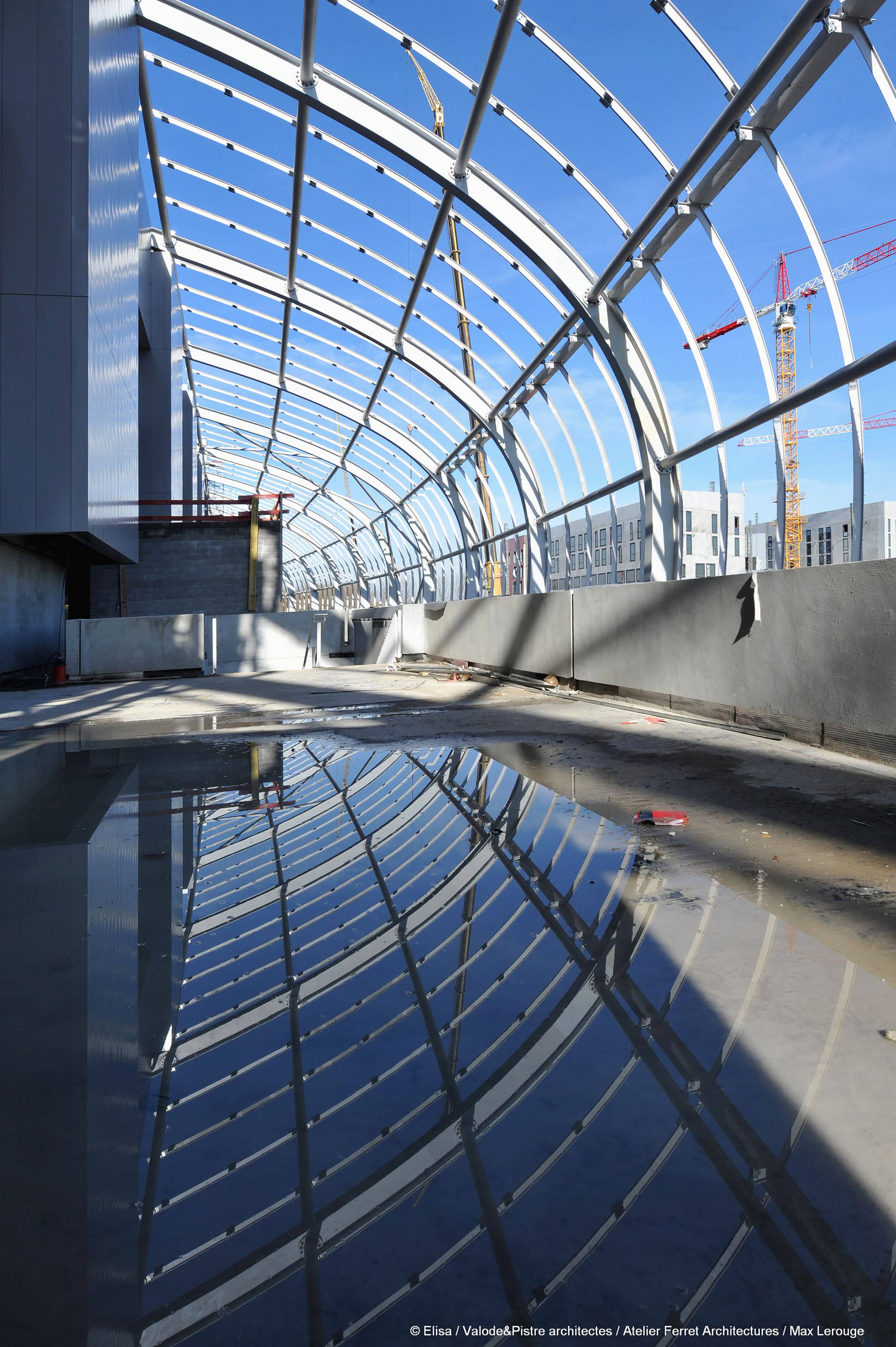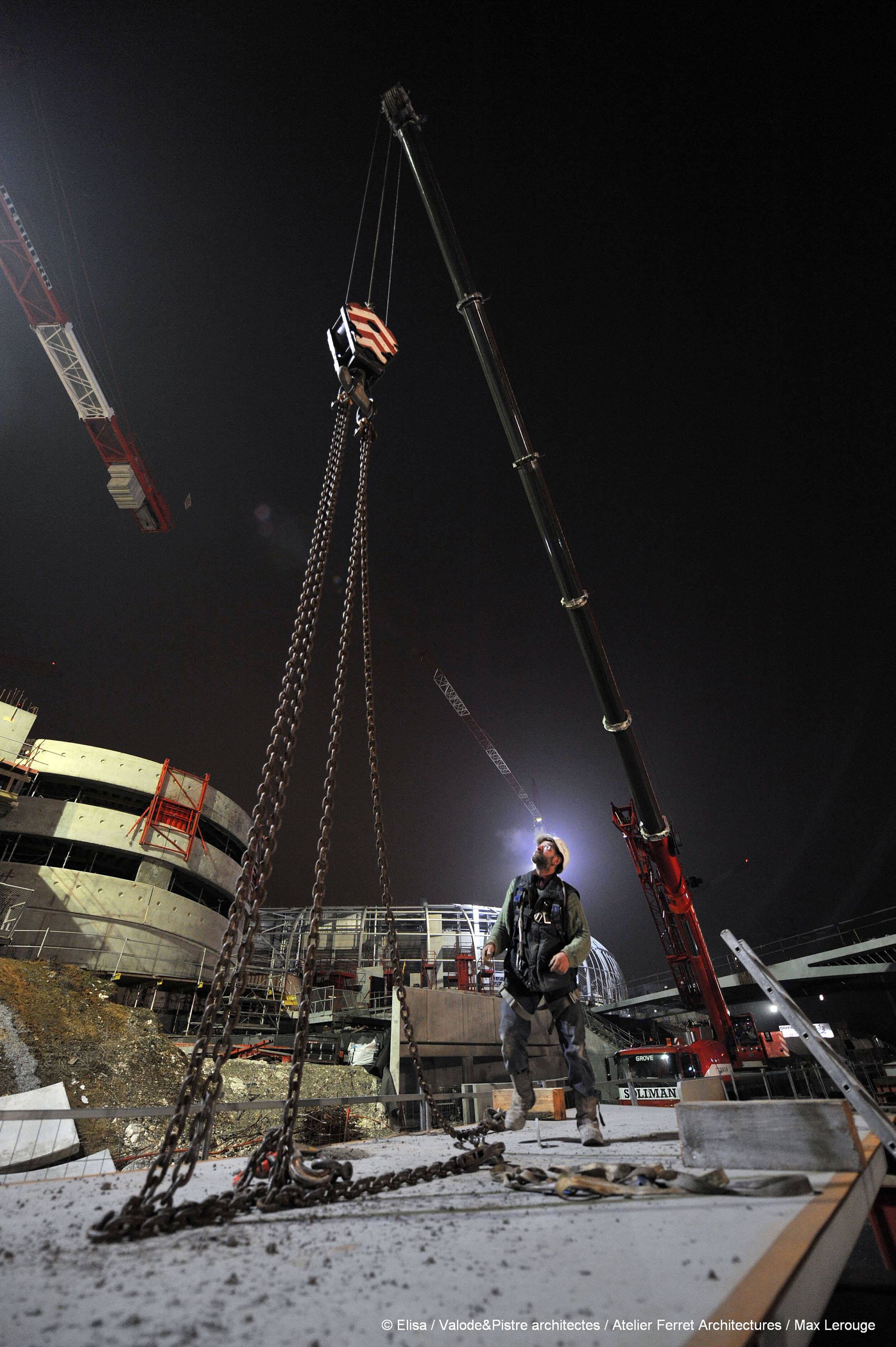 RT 2012, photovoltaïque intégré au parking sillo, récupération EP pour arrosage pelouse, Ventilation double Flux, Extrême compacité : 3 équipements en 1 : 1 Stade + 1 Arena + 1 Zénith.